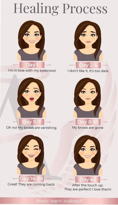 Day 5 - 9: As the scabs start falling off, brows may appear patchy, flaky, and feel itchy. Do not pick the scabs! Doing so will remove pigment!